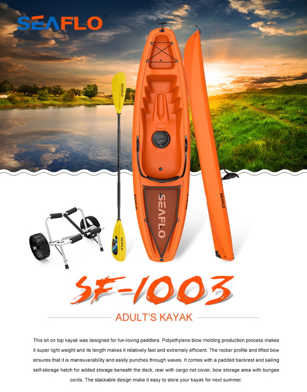 his sit on top kayak was designed for fun-loving paddlers. Polyethylene blow molding production process makes it super light weight and its length makes it relatively fast and extremely efficient. The rocker profile and lifted bow ensures that it is maneuverability and easily punches through waves. It comes with a padded backrest and sailing self-storage hatch for added storage beneath the deck, rear with cargo net cover, bow storage area with bungee cords. The stackable design make it easy to store your kayak for next summer.