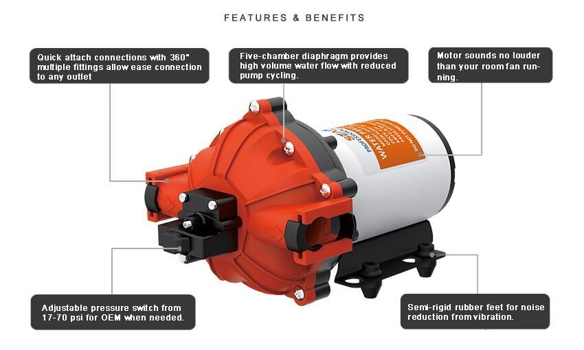 The 52-Series is our Heavy-Duty water pump. It provides high volume water flow with reduced pump cycling, thanks to the large five-chamber diaphragm. Quick Attach Fittings make installation or replacement easy. These models are designed to run on water systems with no accumulator tank necessary, and up to five fixtures! It is also suited for use with a holding tank water system, as may be found in a boat, RV or remote cabin. It provides up to 5.0 gallons per minute. The 52-Series pumps are self-priming, and can run dry without damage, performance reliable. This automatic demand water system pump has a built-in pressure switch, which automatically starts and stops and stops the pump when the faucet is opened and closed. They are easy to install service and winterize.