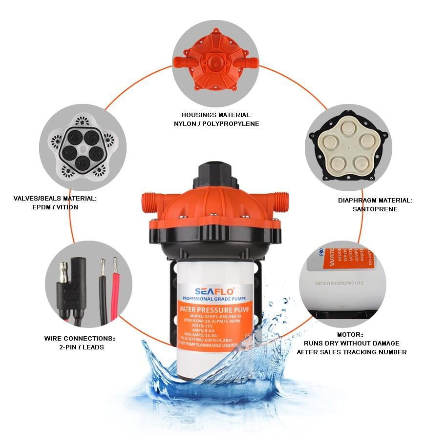The 55 Series is our Heavy-Duty water pump. It provides high volume water flow with reduced pump cycling, thanks to the large five-chamber diaphragm. These models are designed to run on water systems with no accumulator tank necessary, and up to five fixtures! It is also suited for use with a holding tank water system, as may be found in a boat, RV or remote cabin. It provides up to 5.0 gallons per minute. The 55-Series pumps are self-priming, and can run dry without damage, performance reliable and low current. With a built-in bypass function, the 55 series is able to reduce rapid cycling and not allow water to flow back from the outlet side to the inlet side of the pump. This automatic demand water system pump has a built-in pressure switch, which automatically starts and stops the pump when the faucet is opened and closed.They are easy to install service and winterize