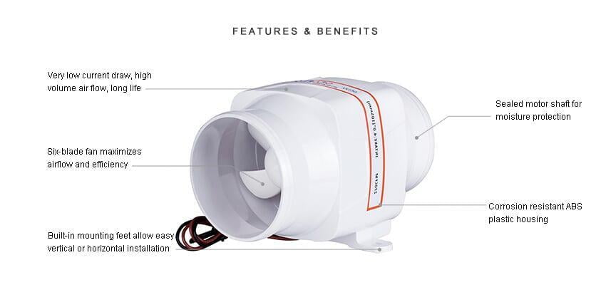 SEAFLO 4” In-line Blowers provide ventilation for bilges, engine compartments, galleys and heads. Designed for efficient, high output operation, these blowers feature our exclusive front and rear shaft seals and corrosion resistant motor housings for long life. Compact and easily installed on any flat surface, SEAFLO In-line Blowers provide higher air flow and lower amp draw.