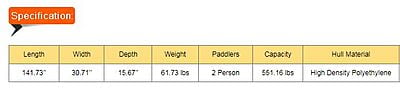 141.73’’ | 30.71’’ | 15.67’’ | 61.73 lbs | 2 Person | 551.16 lbs | High Density Polyethylene |