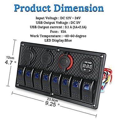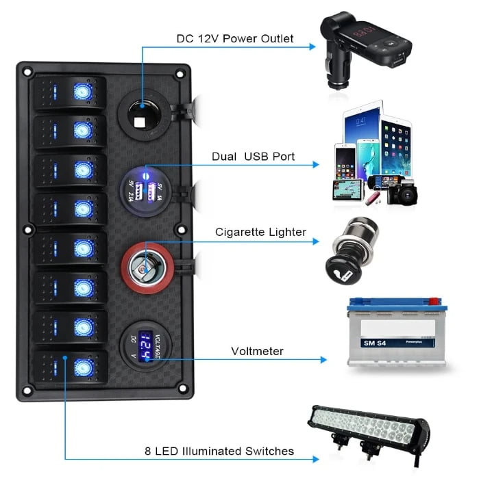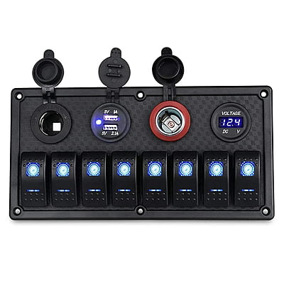 8 Gang Rocker Switch Panel with Blue Light + Cigarette Lighter Socket + Voltmeter + Dual USB