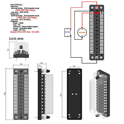 * 【Best Conductivity】 12-way fuse block for ATC/ATO (medium size) fuses with positive and negative terminals. This means that there is a negative terminal for each positive terminal screw. Max. operating voltage: 32V DC; max. 20A per circuit and 75A per panel.