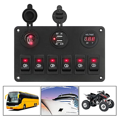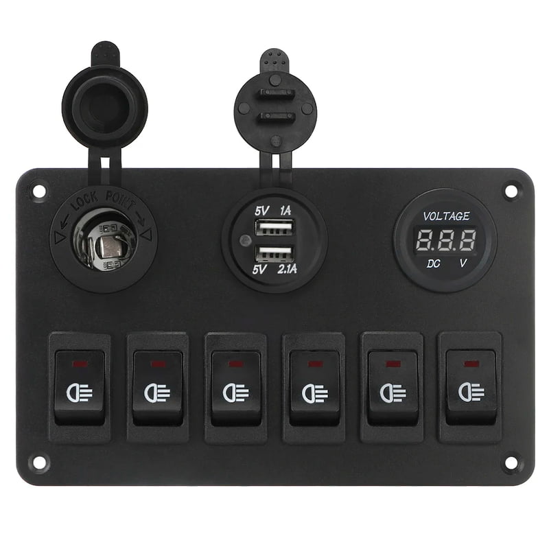 6 Gang Switch Aluminium With Dual USB + Cigarette Lighter Socket + LED Digital Voltmeter