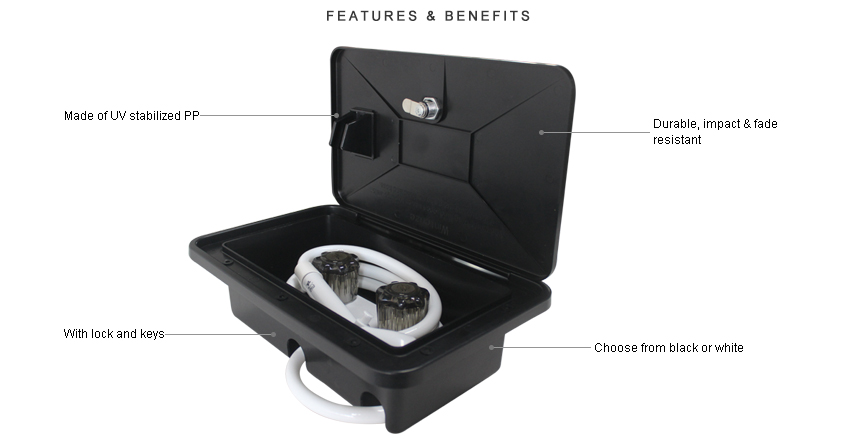 SEAFLO RV External Shower Box is made of UV stabilized PP, which is with lock and keys. The box is durable, impact & fade resistant.